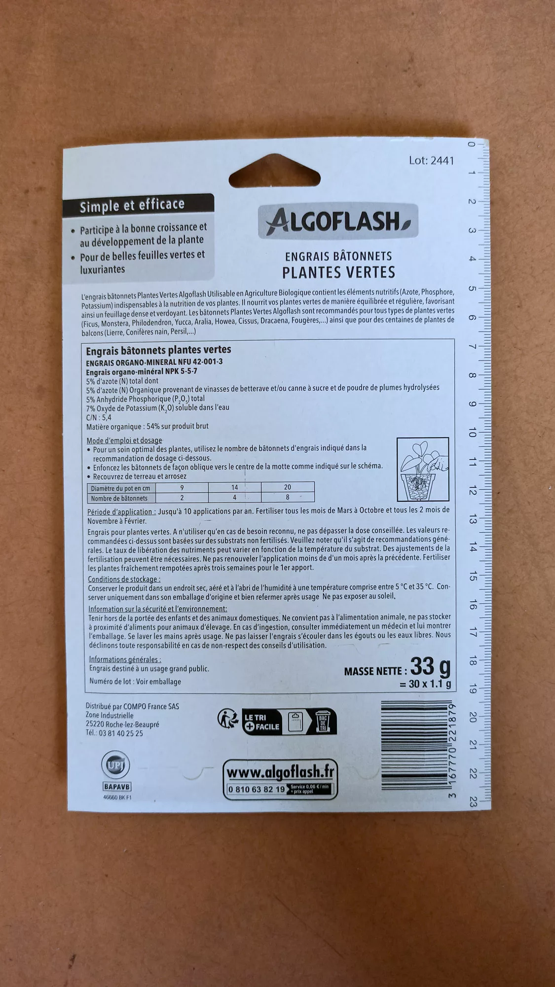 L’engrais bâtonnets Plantes Vertes Algoflash contient tous les éléments nutritifs (Azote, Phosphore, Potassium) indispensables à la nutrition de vos plantes. Grâce à une libération progressive des éléments fertilisants, il nourrit vos plantes vertes de manière équilibrée et régulière. Il favorise ainsi un feuillage dense et vergoyant.