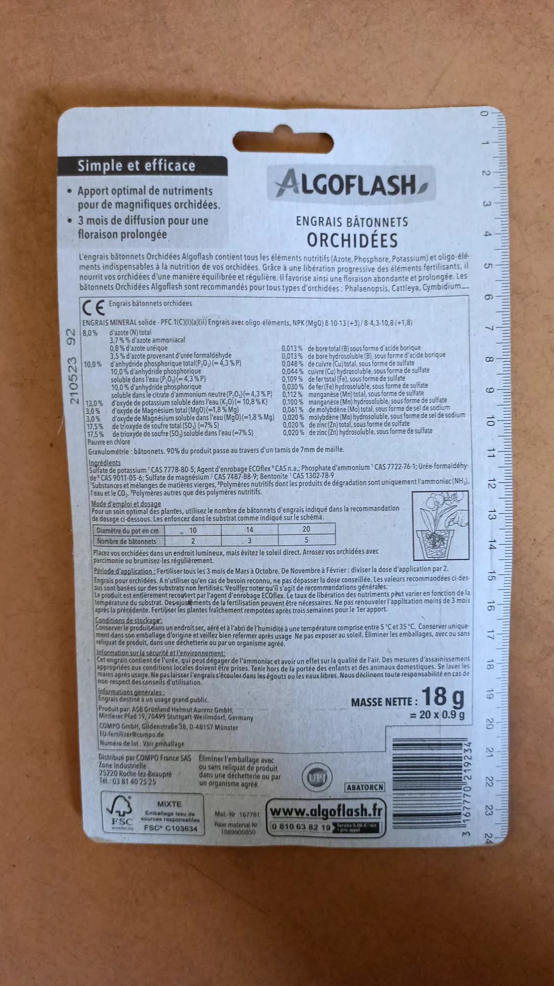 L’engrais bâtonnets Orchidées Algoflash contient tous les éléments nutritifs (Azote, Phosphore, Potassium) et oligo-éléments indispensables à la nutrition de vos orchidées. Grâce à une libération progressive des éléments fertilisants, il nourrit vos orchidées de manière équilibrée et régulière. Il favorise ainsi une floraison abondante et prolongée.