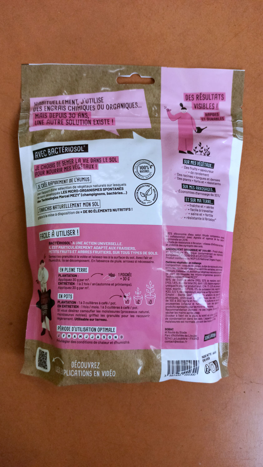 L’éco fertilisant Bactériosol sème la vie dans vos sols. Par son action universelle, il est utilisable sur tous les types de sol, en pleine terre et en pot et pour toutes cultures, notamment vos fraisiers, framboisiers, groseillers et autres petits fruits. Période d’utilisation : Février à novembre Quels sont les bénéfices de Bactériosol ? Bon pour mon jardin :