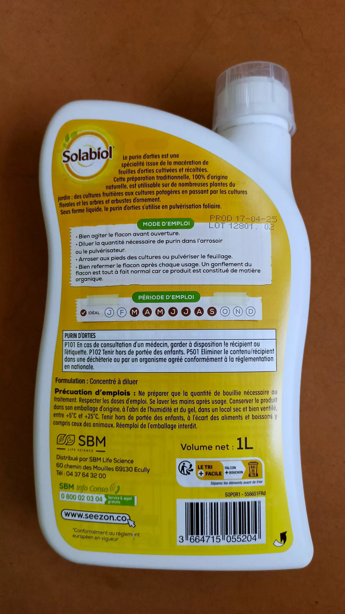 Le purin d’orties concentré Solabiol est une spécialité issue de la macération de feuilles d’orties cultivées et récoltées. Cettre préparation traditionnelle, 100% d’origine naturelle, est utilisable sur de nombreuses plantes du jardin : des cultures fruitières aux cultures potagères en passant par les cultures florales et les arbres et arbustes d’ornement.
