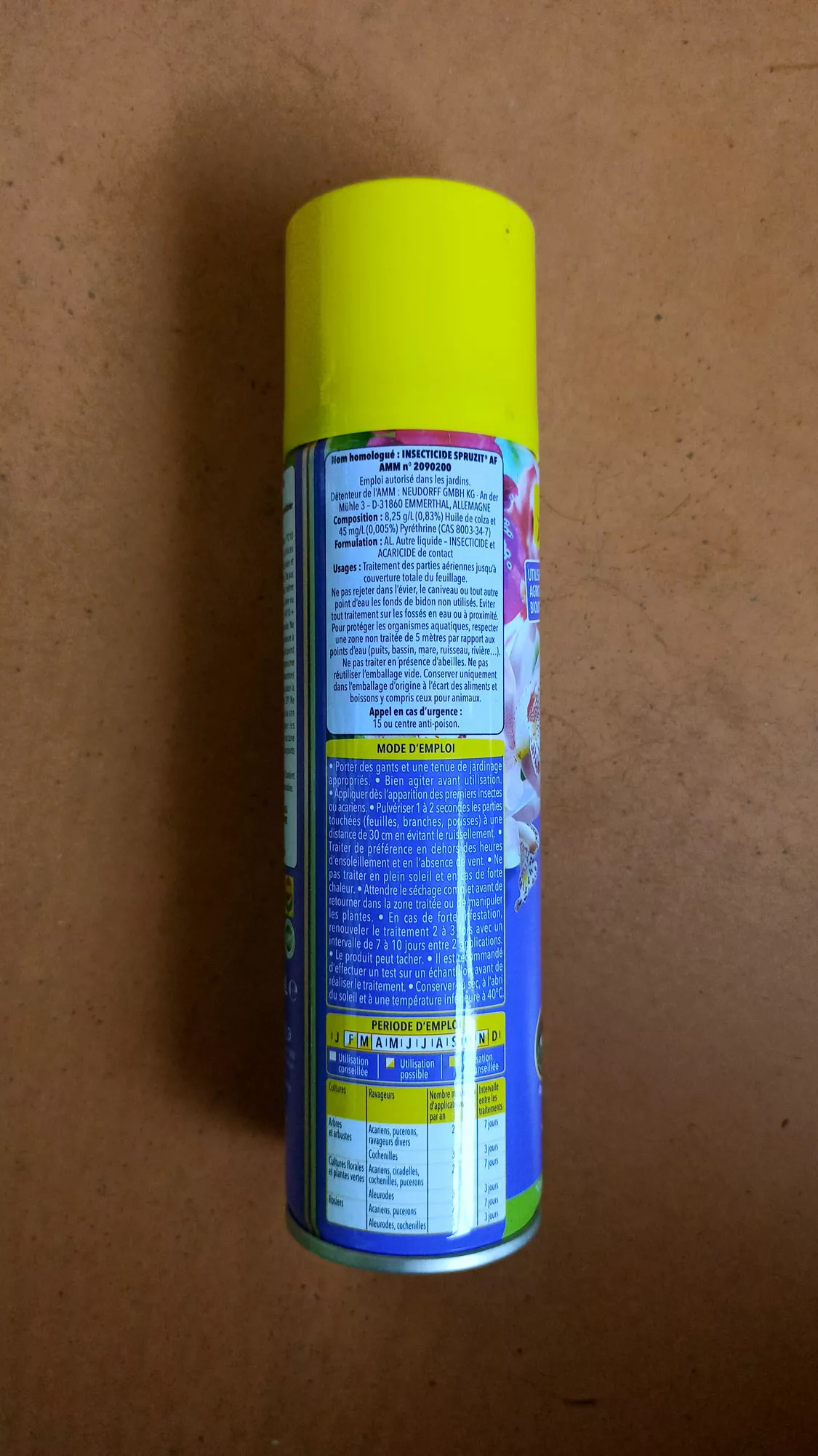 | Informations relatives à la sécurité et à l'environnement | EUH401 – Respecter les instructions d'utilisation pour éviter les risques pour la santé humaine et l'environnement, H229 – Récipient sous pression : peut éclater sous l'effet de la chaleur., P102 – Conserver hors de portée des enfants, P210 – Tenir à l’écart de la chaleur, des surfaces chaudes, des étincelles, des flammes nues et de toute autre source d’inflammation. Ne pas fumer., P251 – Ne pas perforer, ni brûler, même après usage., P270 – Ne pas manger, boire ou fumer en manipulant le produit, P410 + P412 – Protéger du rayonnement solaire. Ne pas exposer à une température supérieure à 50°C., P501 – Eliminer le contenu et le récipient dans une déchetterie ou par un organisme agréé, SP1 – Ne pas polluer l'eau avec le produit ou son emballage, SPe3 – Pour protéger les organismes aquatiques, respecter une zone non traitée de 5 mètres par rapport aux points d'eau |