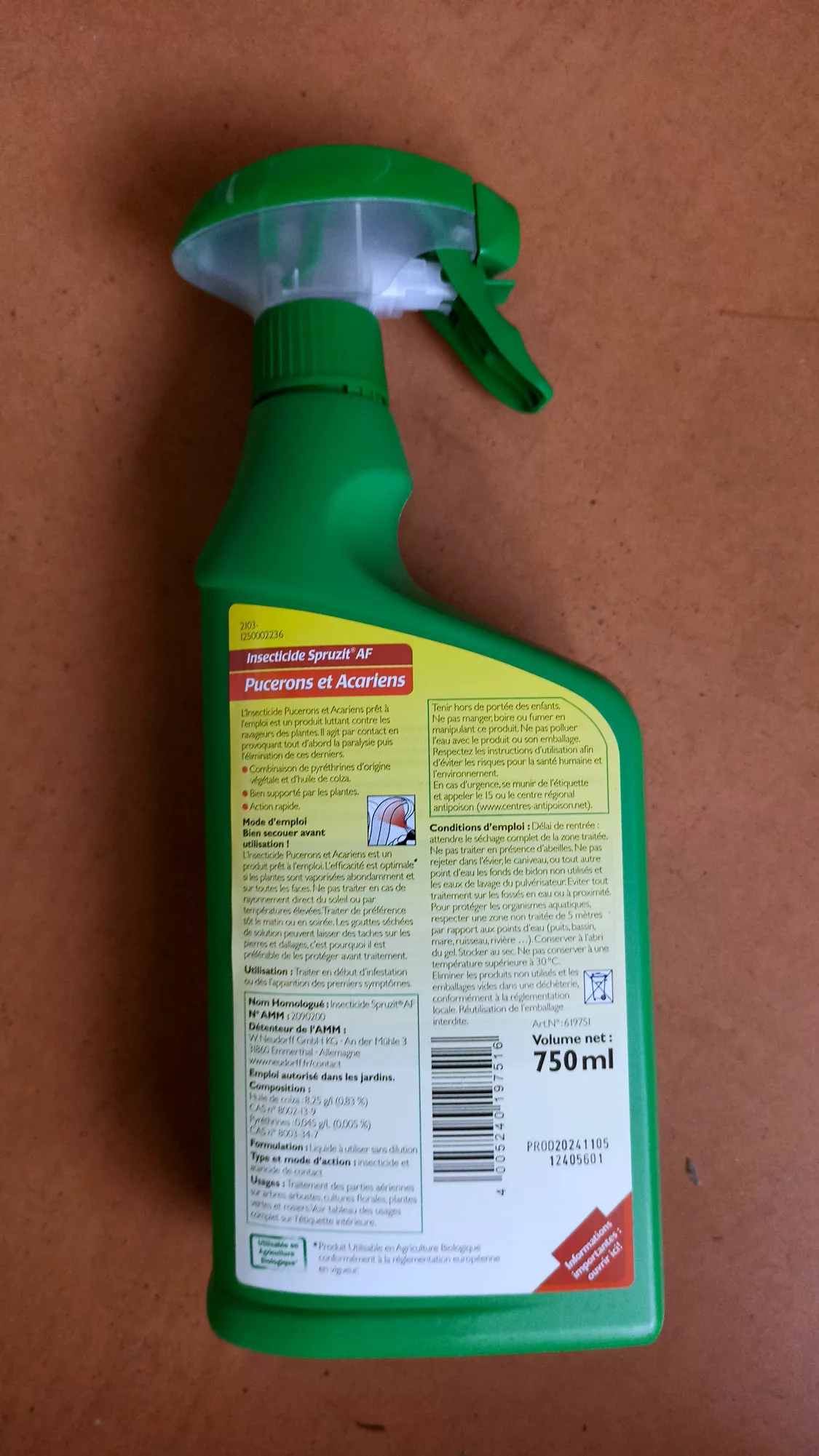 Composés de pyrèthre et d’huile de colza, substances actives d’origine végétale, le produit agit par contact afin d’éliminer rapidement les insectes nuisibles.